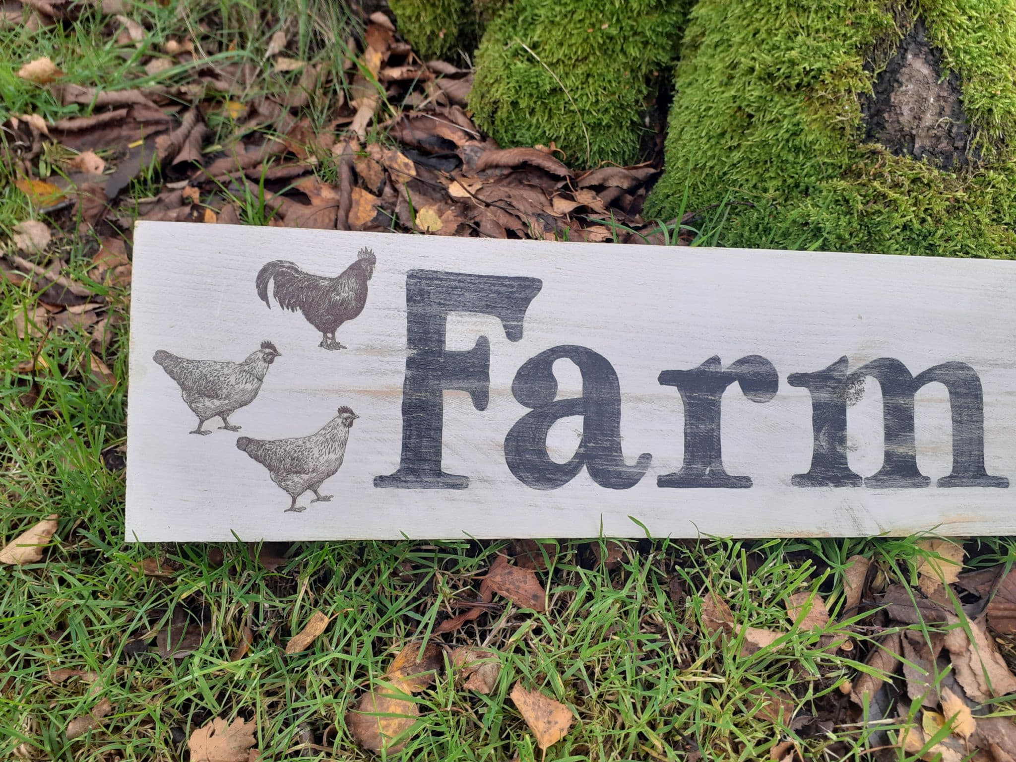 Home / Plaques & Signs / Farmhouse Sign..... SOLD Farmhouse Sign..... SOLD £25.00 Stock Status: Sold Out Sorry, this item is out of stock Add to your Wish List Info A lovely rustic handmade wooden FARMHOUSE sign , with chicken detail , & 2 hangers to hang ..... measures 100cms x 15 cms