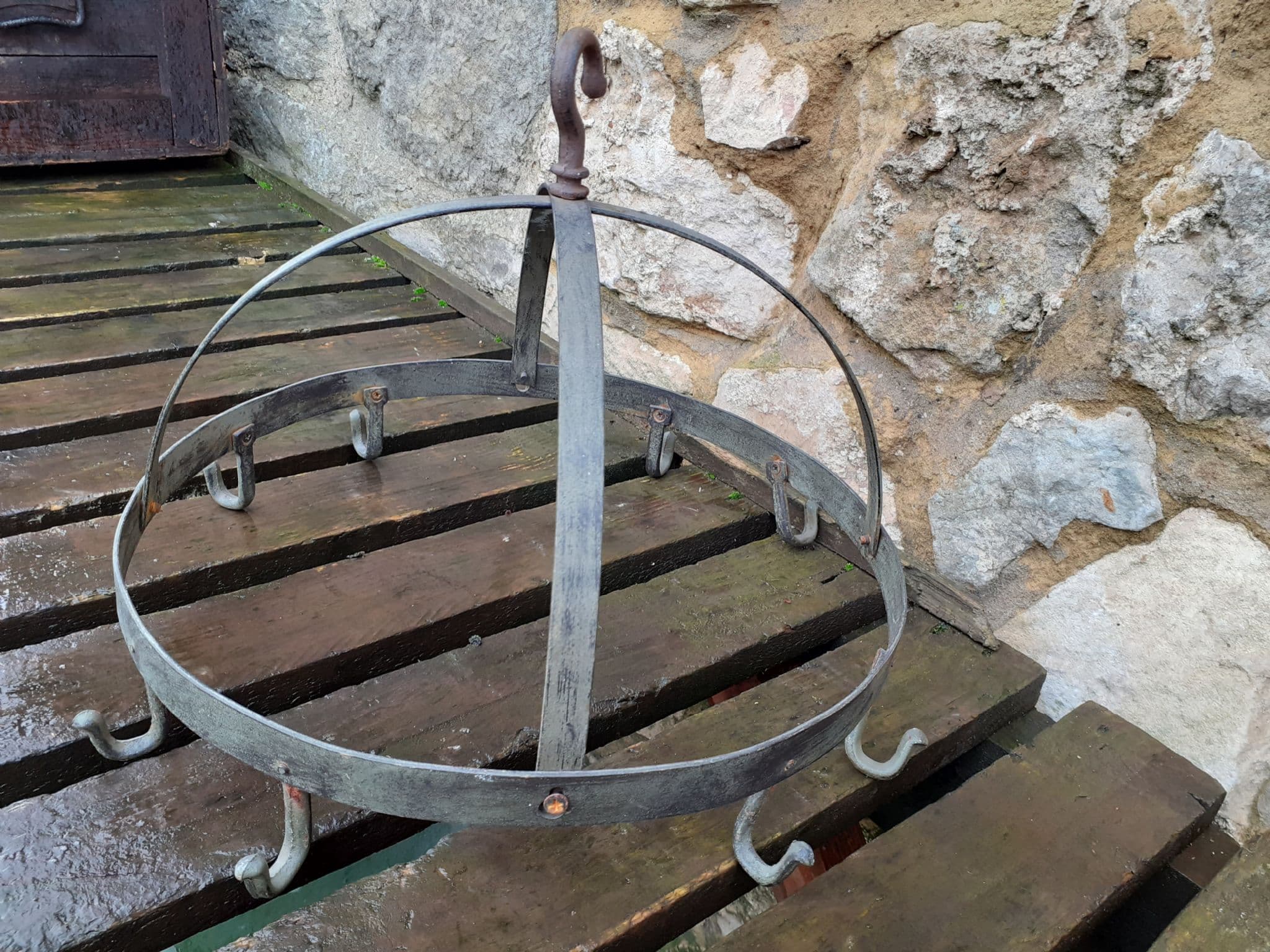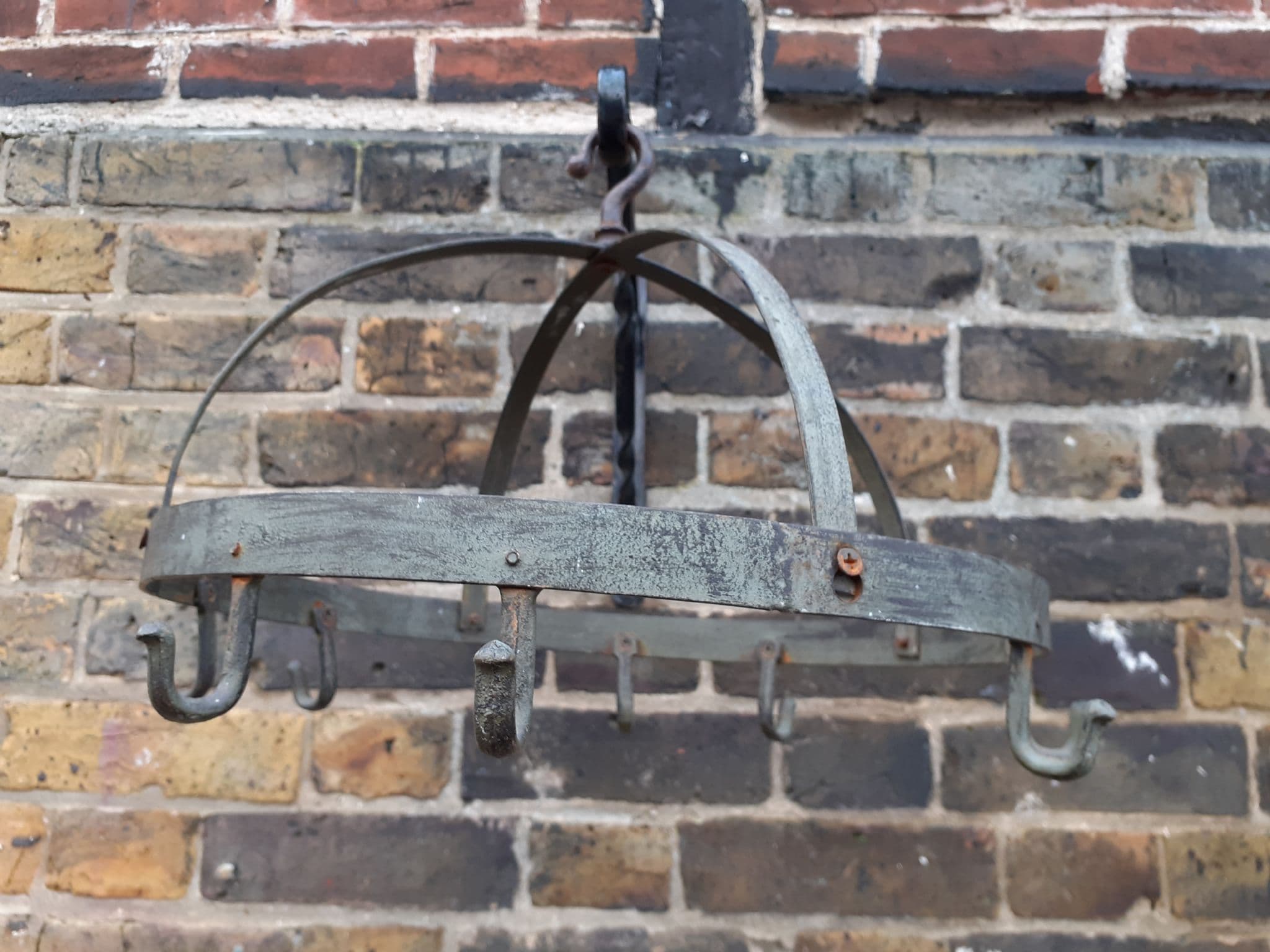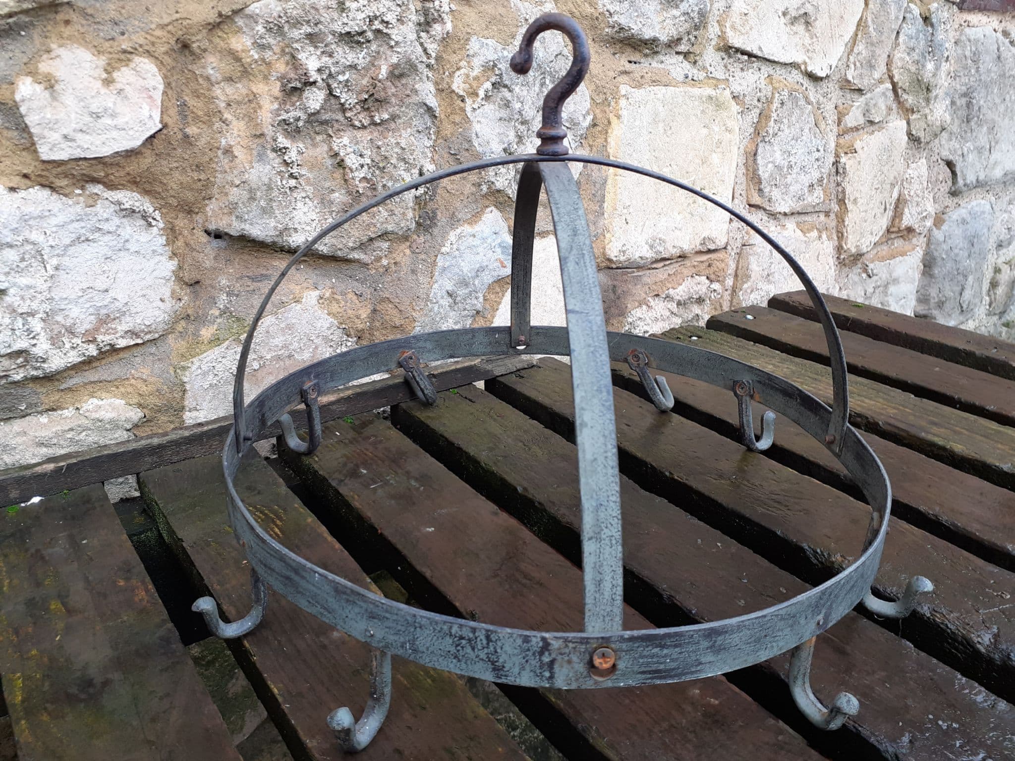 Home / Shop Stock / Utensil Hanger ...... SOLD Utensil Hanger ...... SOLD £38.00 Stock Status: Sold Out Sorry, this item is out of stock Add to your Wish List Info SOLD ...... An old fashioned metal utensil hanger or herb dryer , circular with hooks ..... 18" diameter